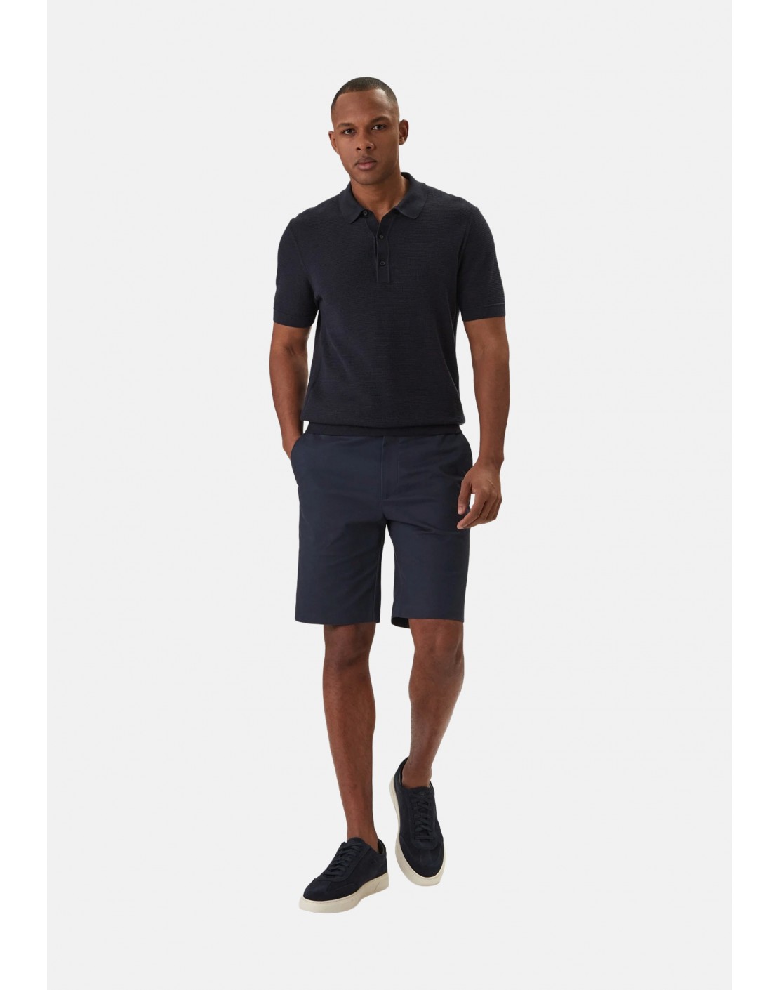 Pliegue central, bolsillos delanteros americanos, bolsillos ribeteados con botones en la parte posterior y bajo vuelto.