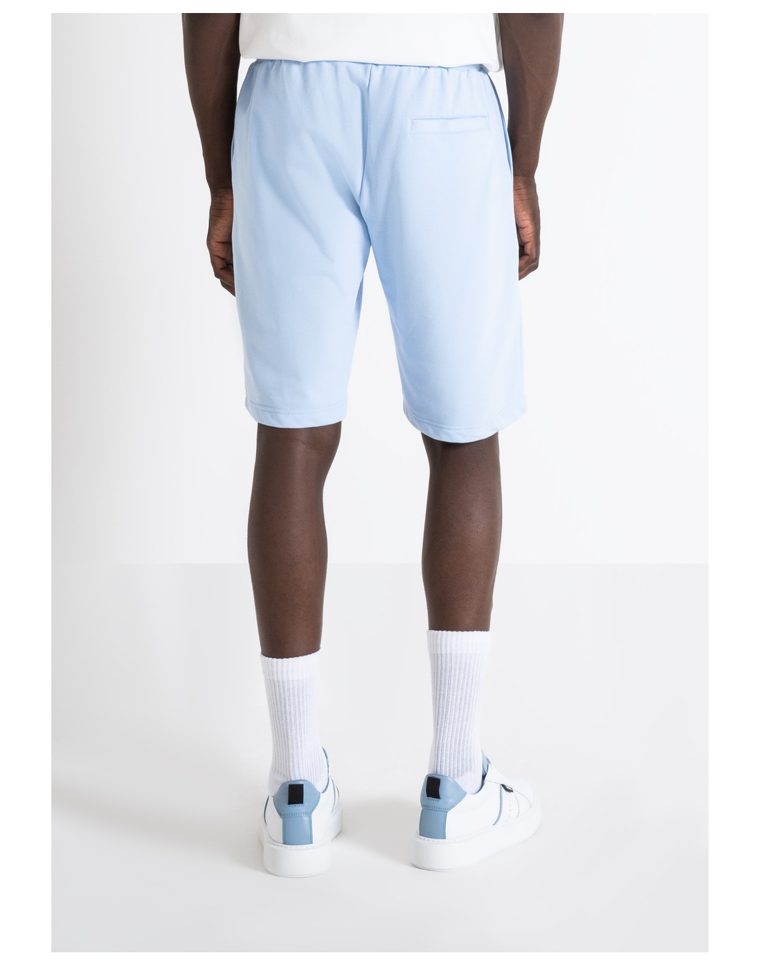 Color sólido y corte regular, con bolsillos laterales, un bolsillo trasero ribeteado y cintura con cordón.