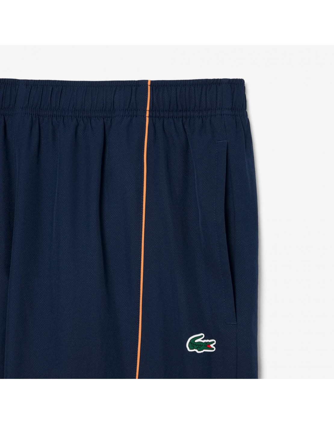 Detalle de marca Lacoste estampado en la parte trasera de la pernera derecha